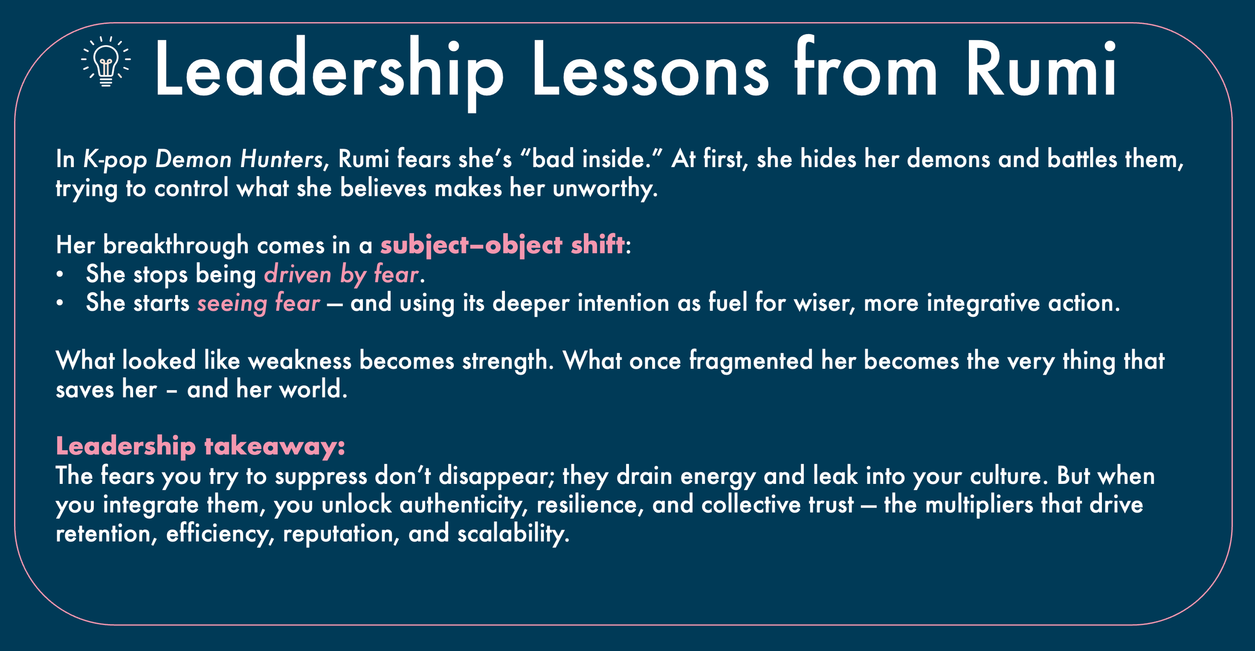 The lesson from K-pop Demon Hunters is clear. Transformation begins within. Executives who integrate their fears expand their capacity — for empathy, for strategy, for results, for uncertainty, for resilience.
